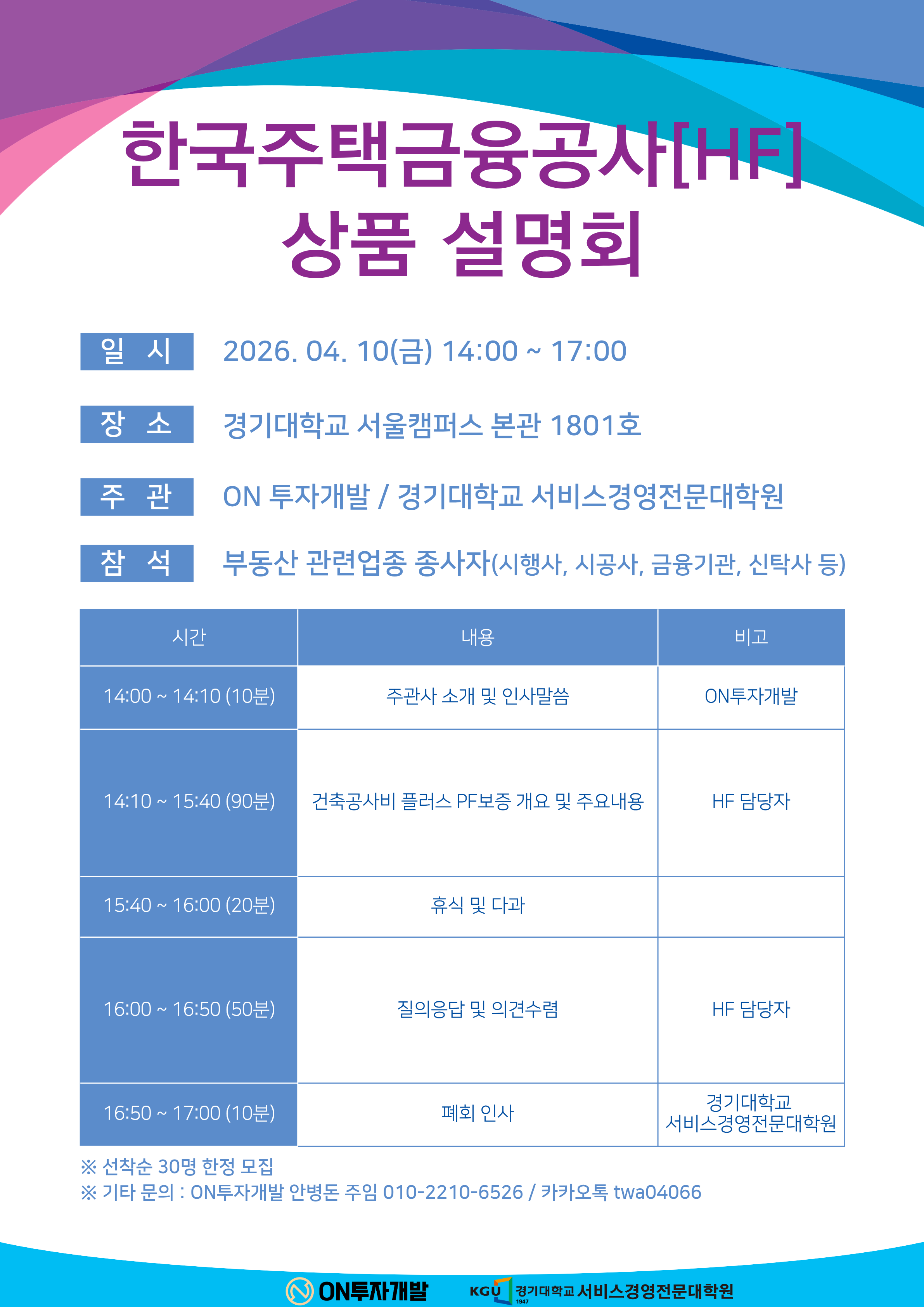 ON투자개발은 오는 2026년 4월 10일, 부동산 개발 및 금융 실무자를 대상으로 한국주택금융공사(HF) 상품설명회를 개최한다.